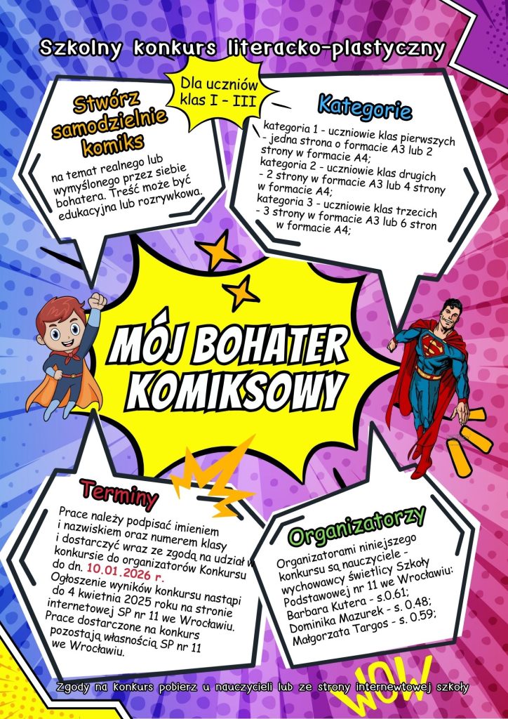 Wszystkich uczniów klas I – III zapraszamy do udziału w konkursie “Mój Bohater Komiksowy”. Przedmiotem konkursu jest stworzenie komiksu nt. realnego lub wymyślonego przez siebie bohatera. Komiks musi być wykonany przez dziecko samodzielnie. Jego treść może mieć charakter edukacyjny lub rozrywkowy. Oceniana będzie kreatywność, wkład pracy, estetyka, poprawność językowa oraz samodzielność. Prace należy podpisać imieniem i nazwiskiem wykonawcy oraz numerem klasy i dostarczyć do Organizatorów Konkursu do dn.10.02.2026 roku.