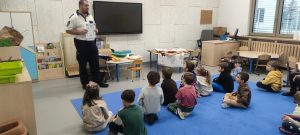 Pan Marcin przeprowadził ciekawą lekcję, podczas której zapoznał przedszkolaków z zasadami bezpieczeństwa w czasie zimowego wypoczynku. Dzieci dowiedziały się, jak bezpiecznie bawić się na śniegu i lodzie, dlaczego nie wolno wchodzić na zamarznięte zbiorniki wodne oraz jak zachować ostrożność podczas zabaw na sankach czy łyżwach. Funkcjonariusz przypomniał również o konieczności noszenia elementów odblaskowych oraz o zasadach bezpiecznego poruszania się po drodze.