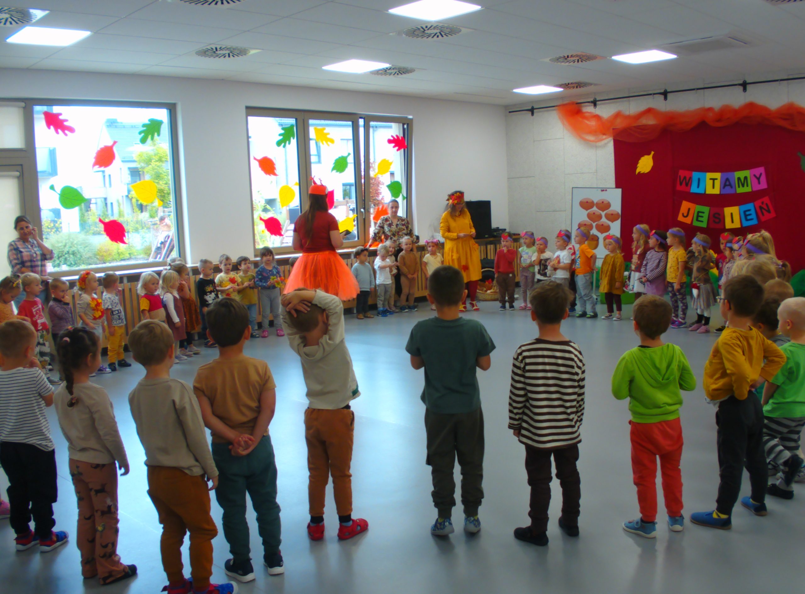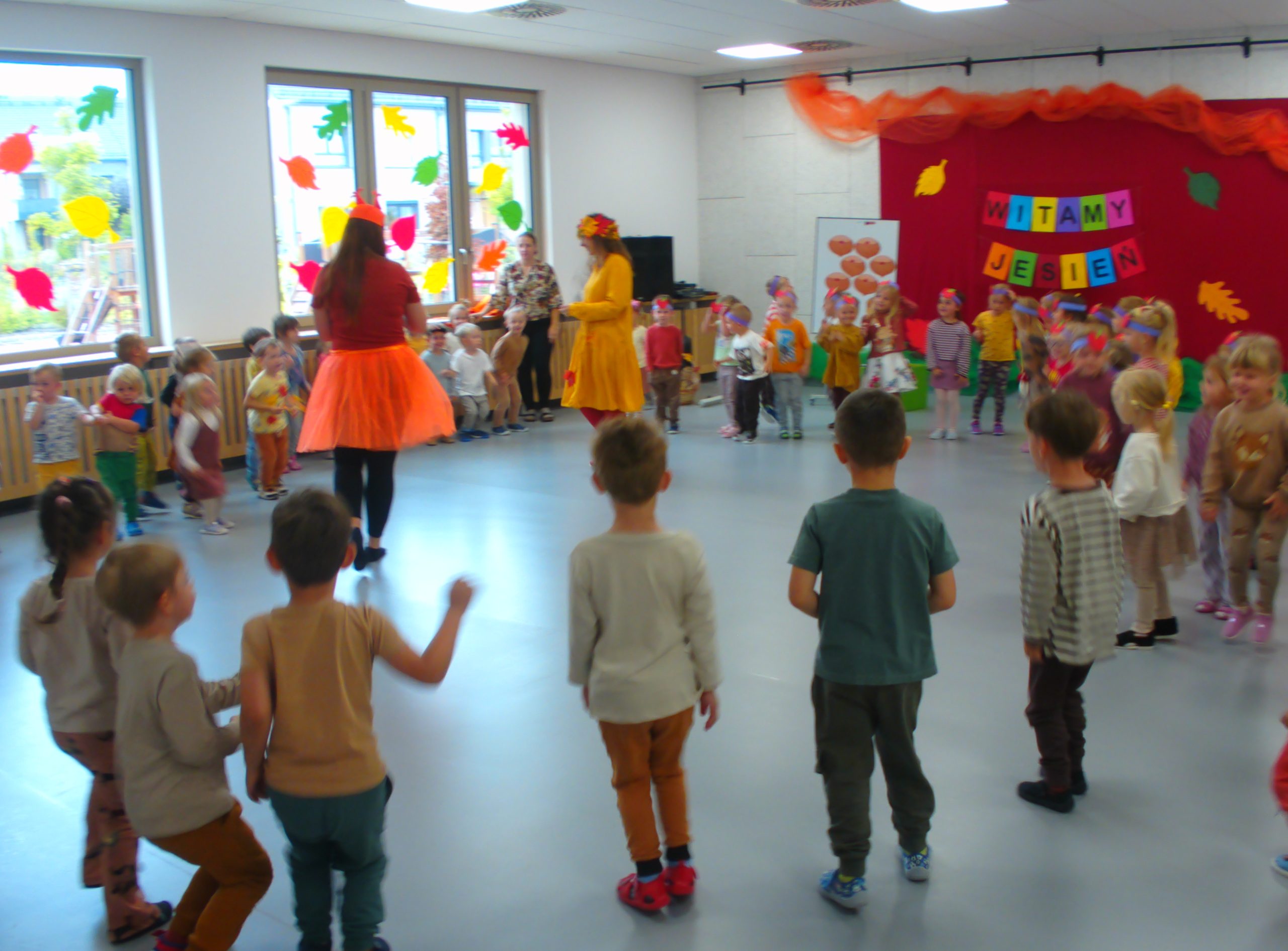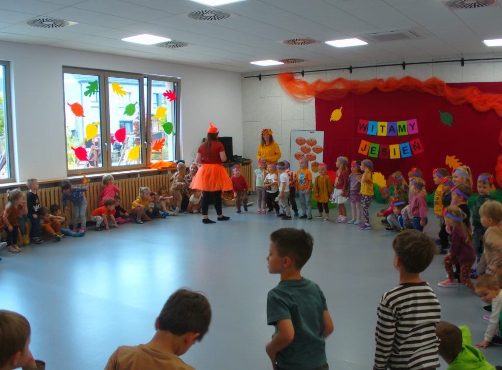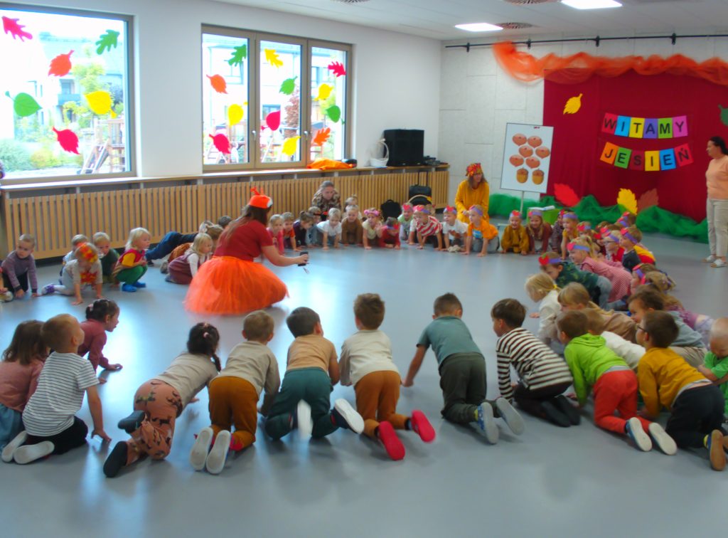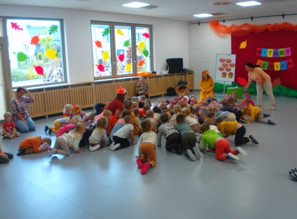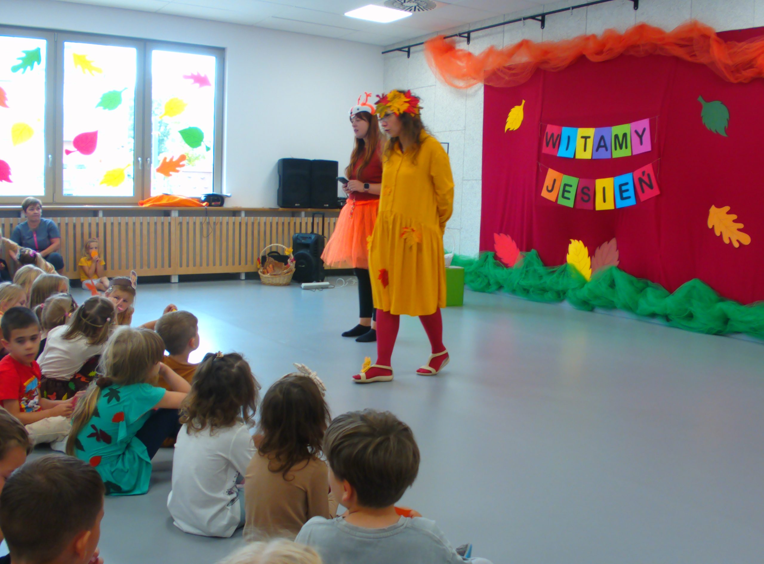 Pani Jesień razem z Wiewiórką przygotowały dla dzieci zabawy, zagadki i tańce.