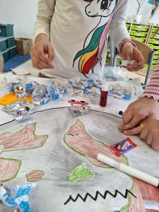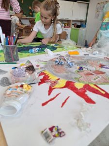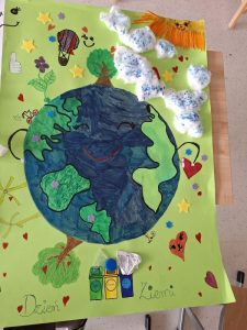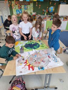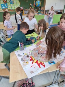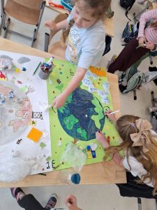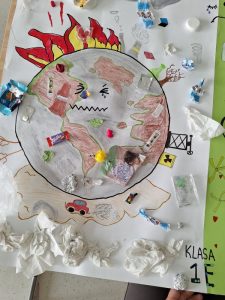 Z okazji Dnia Ziemi przygotowywaliśmy plakaty edukacyjne dotyczące ekosystemu oraz promujące Dzień Ziemi. W świetlicy klasy 1e dzieci postanowiły przedstawić „smutną” i „szczęśliwą” Ziemię. Na smutnej planecie znalazły się kopalnie, kominy, płonęły lasy, ziemia była sucha, a dookoła panował smog. Wszędzie były porozrzucane śmieci. Tego dnia, podczas wykonywania plakatu poćwiczyliśmy – co i jak się segreguje do pojemników na śmieci. Dodatkowo zamiast wyrzucać śmieci do kosza, wszystkie postanowiliśmy przykleić klejem na gorąco do naszej „smutnej Ziemi”. Po przeciwnej stronie, na drugiej kartce papieru, namalowaliśmy „uśmiechniętą” Ziemię. W tej części pracy było wiele kwiatów, drzew, wiatraków elektrycznych, pojemników do segregowania śmieci i rowerów. Tej pracy towarzyszyło wiele emocji. Dzieci nie chciały „nieszczęśliwej” Ziemi, były smutne. Mamy nadzieję, że nasza praca, jak i pozostałe –