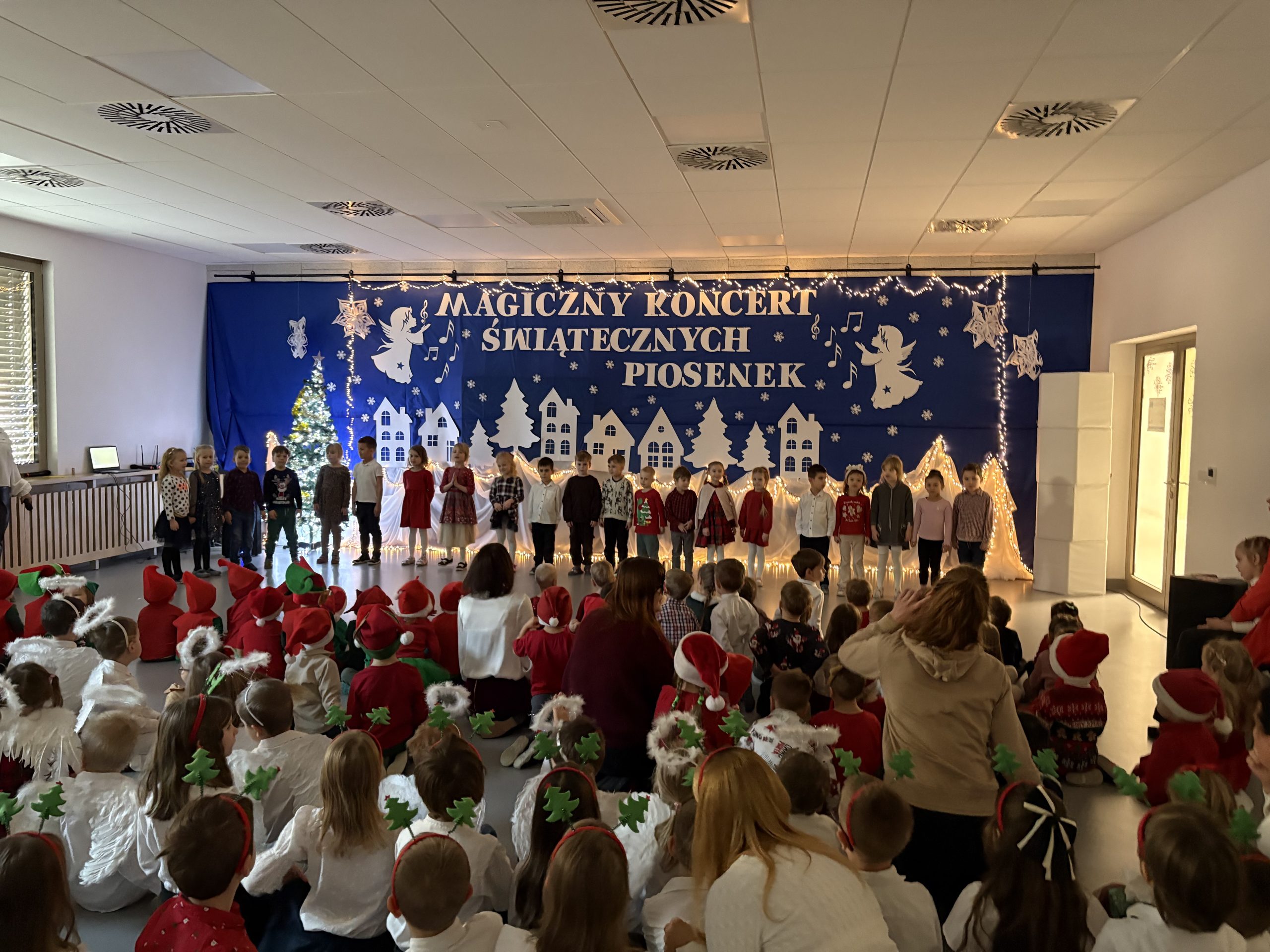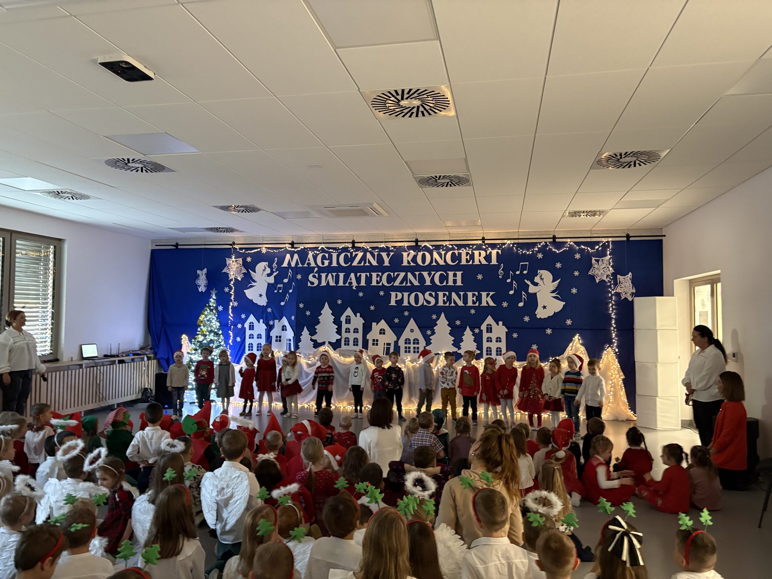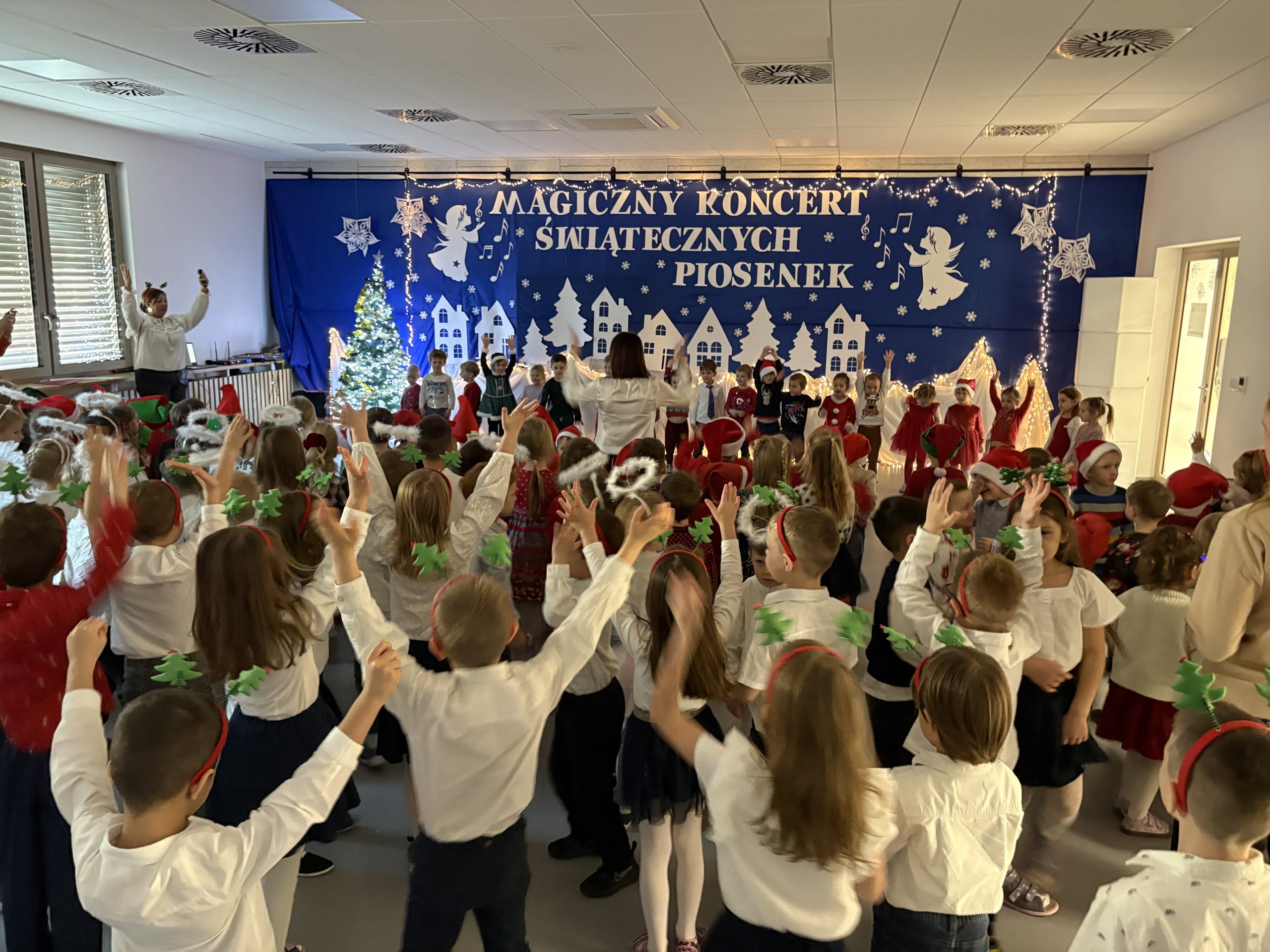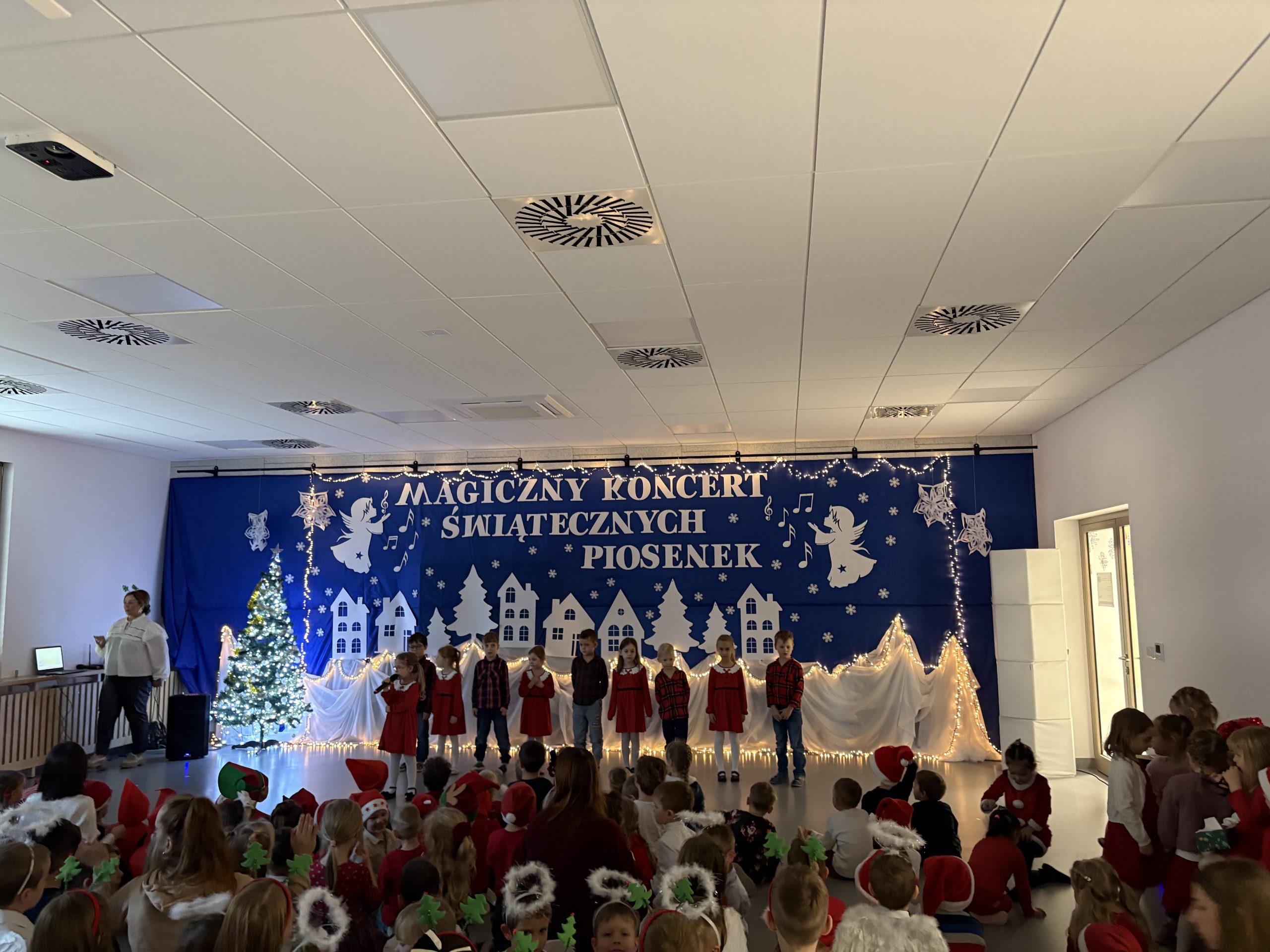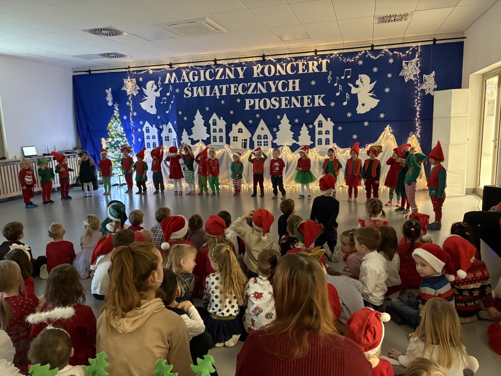 Każda grupa przedszkolna zaprezentowała własną piosenkę świąteczną, wzbogaconą o odpowiedni akcent, starannie dobrany repertuar oraz elementy ruchowe i sceniczne, które podkreślały charakter utworów. Mali artyści z wielkim zaangażowaniem i radością wystąpili przed publicznością, pokazując swoje talenty i odwagę sceniczną.