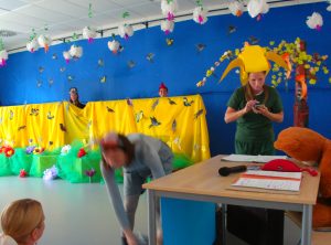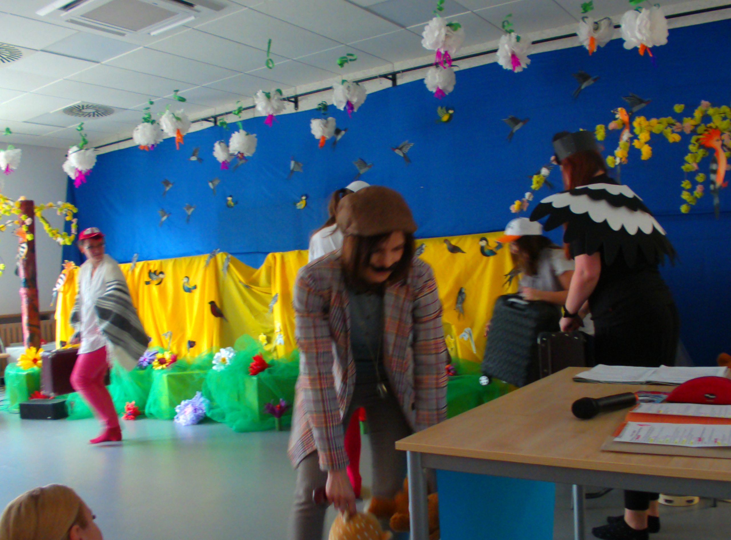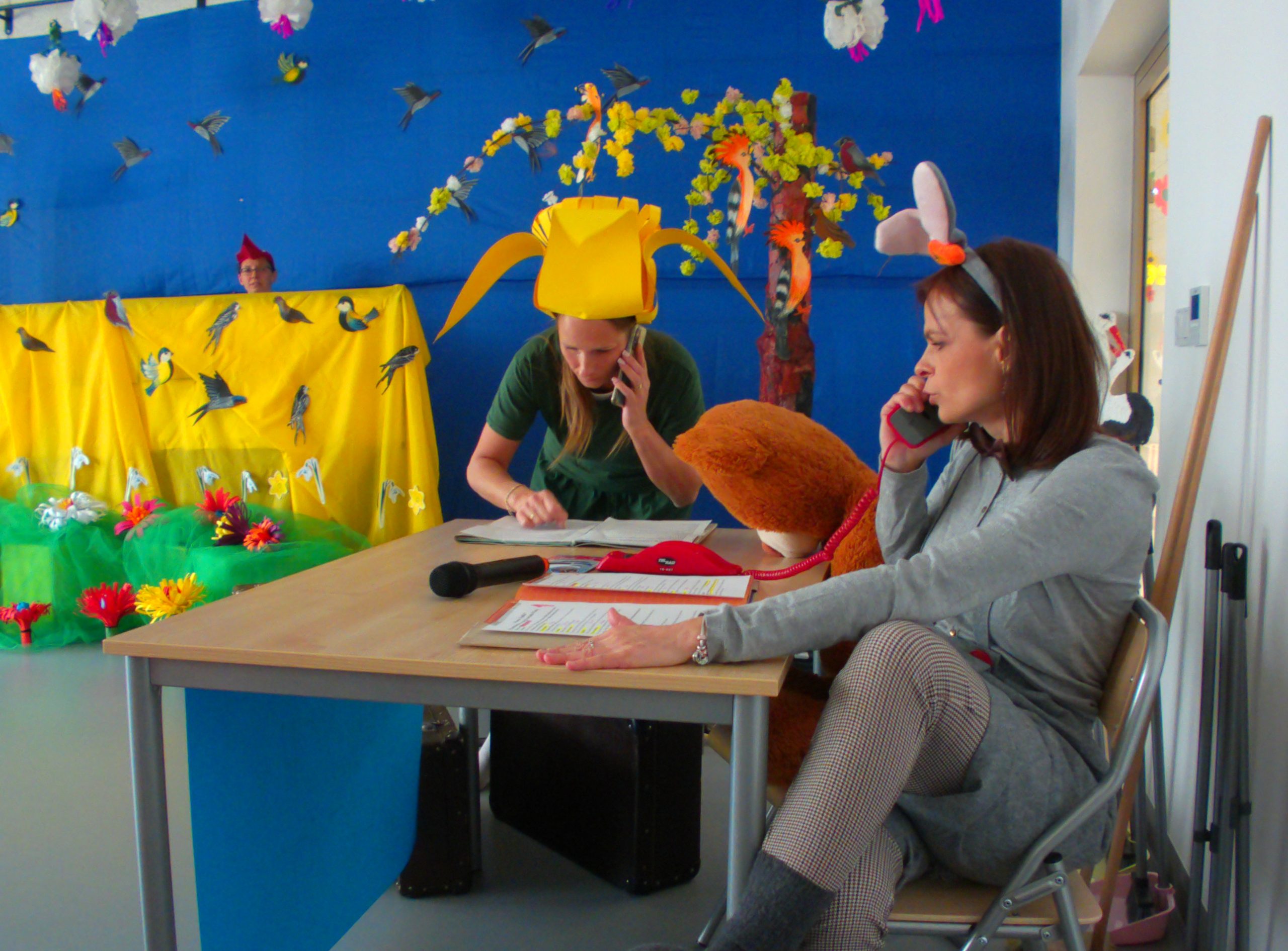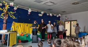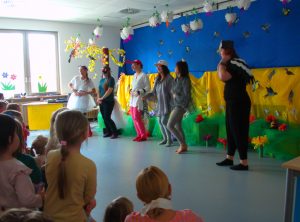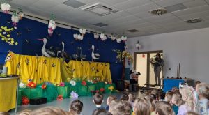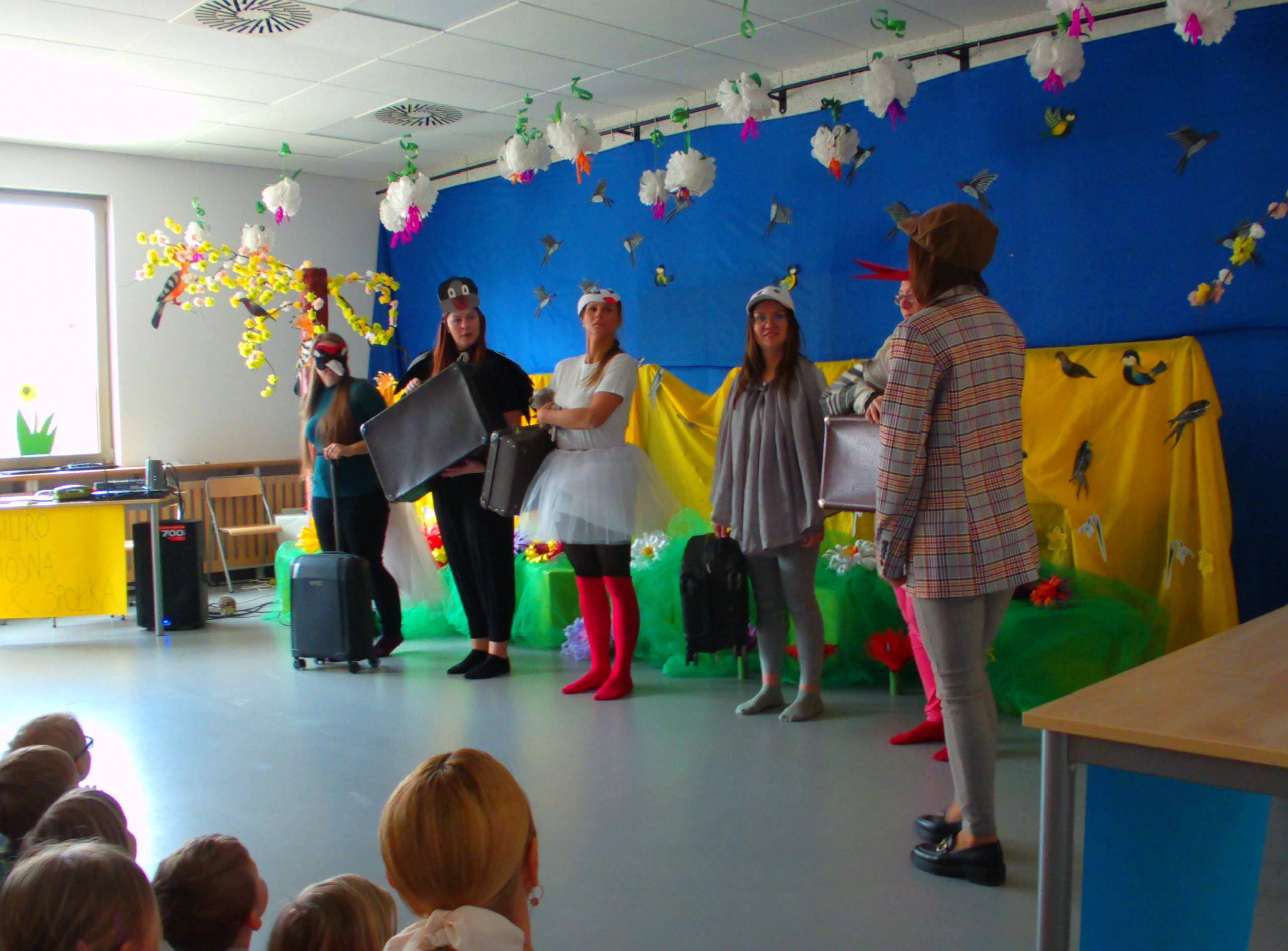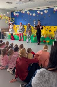Na początku nauczycielki wcieliły się w aktorów, odgrywając zabawne i dynamiczne scenki o nadchodzącej wiośnie. Następnie, w drugiej części spektaklu, pojawiły się kukiełki, które w magiczny sposób ożywiły historię. Warto podkreślić ogromną kreatywność nauczycielek – dekoracje i kukiełki były wykonane własnoręcznie, co dodało przedstawieniu wyjątkowego uroku.