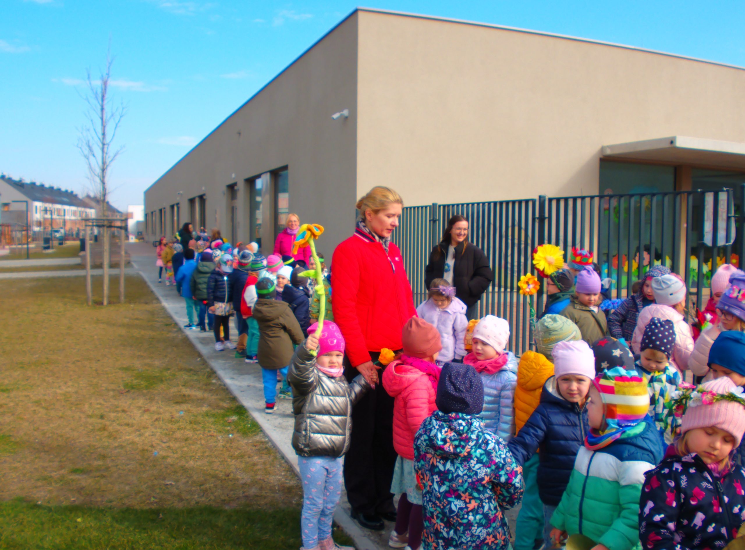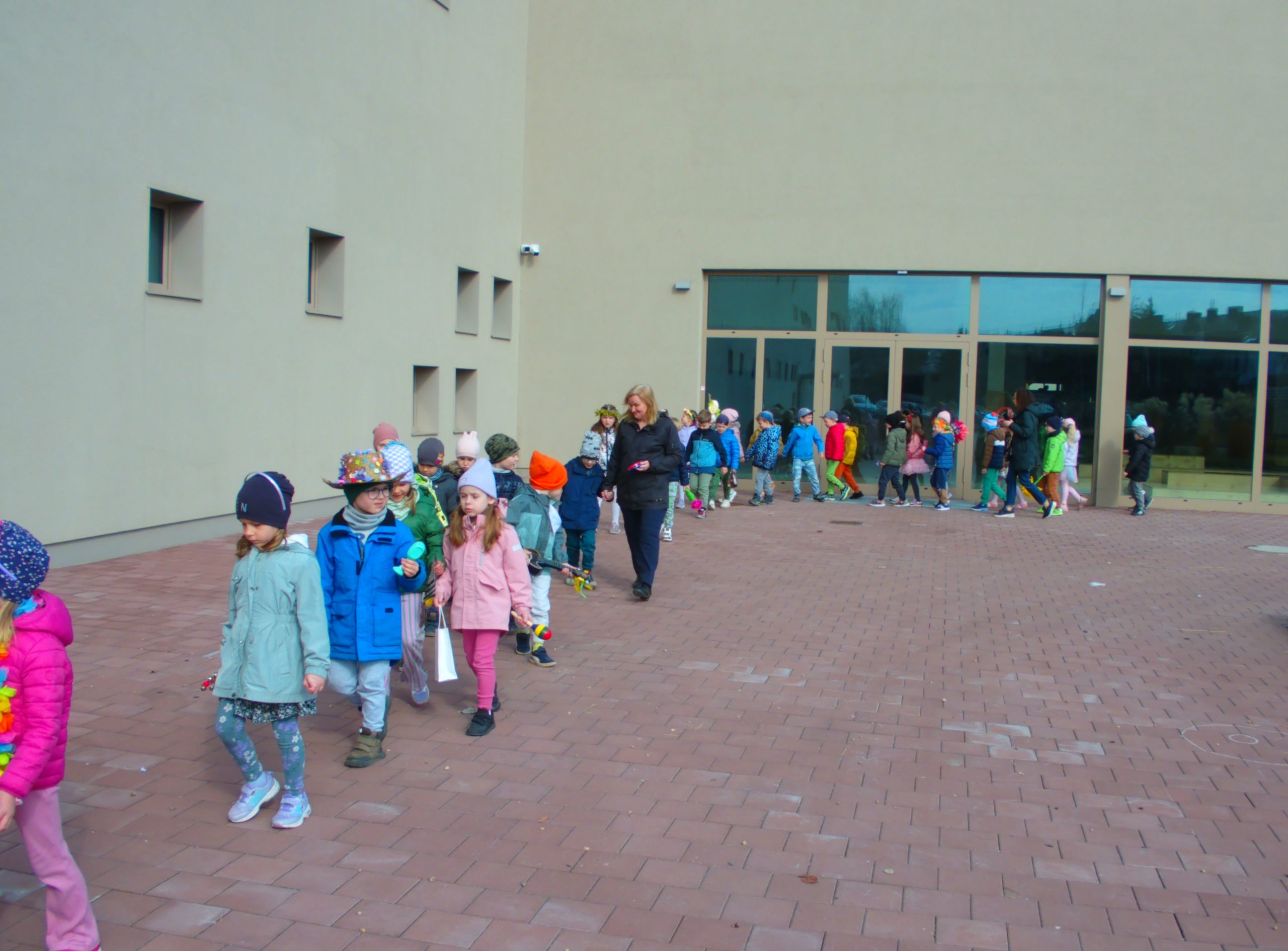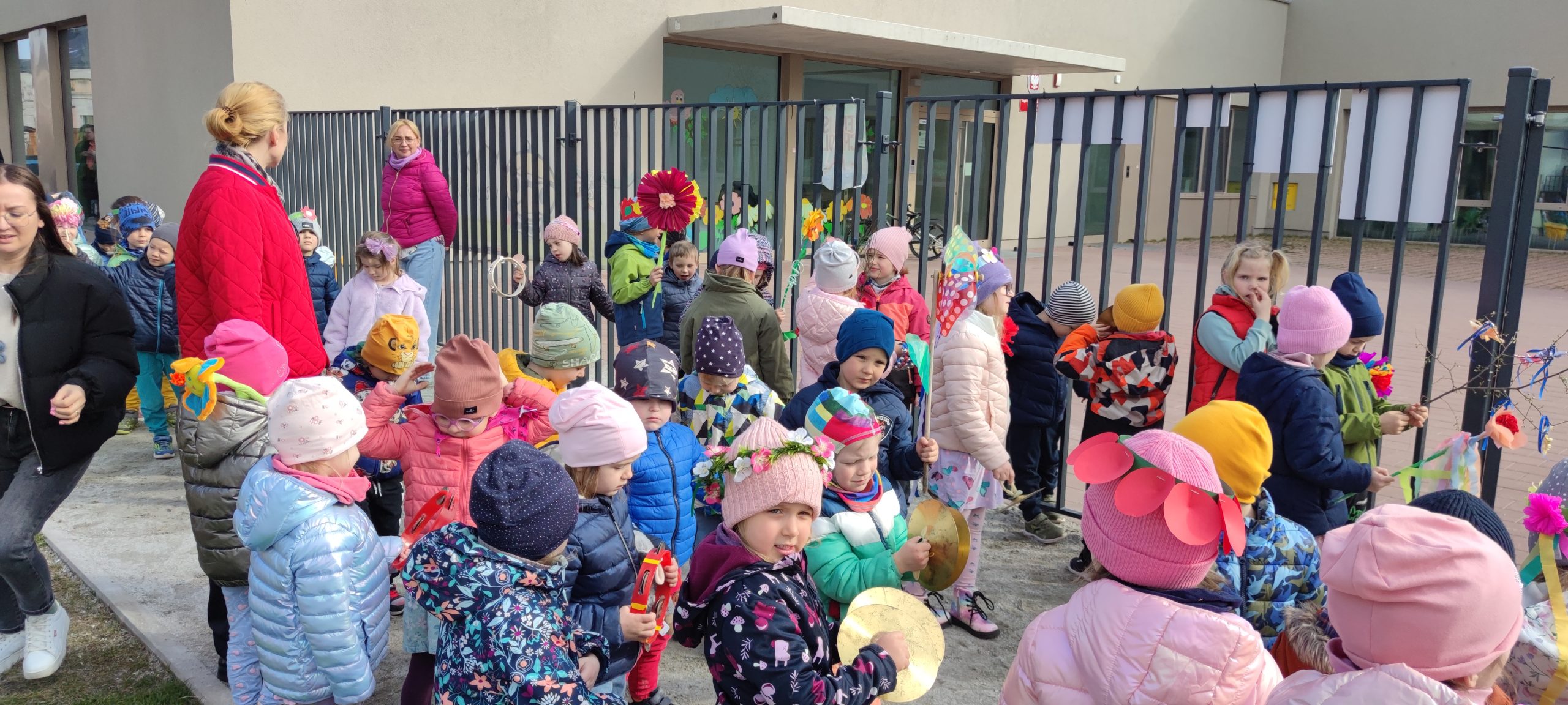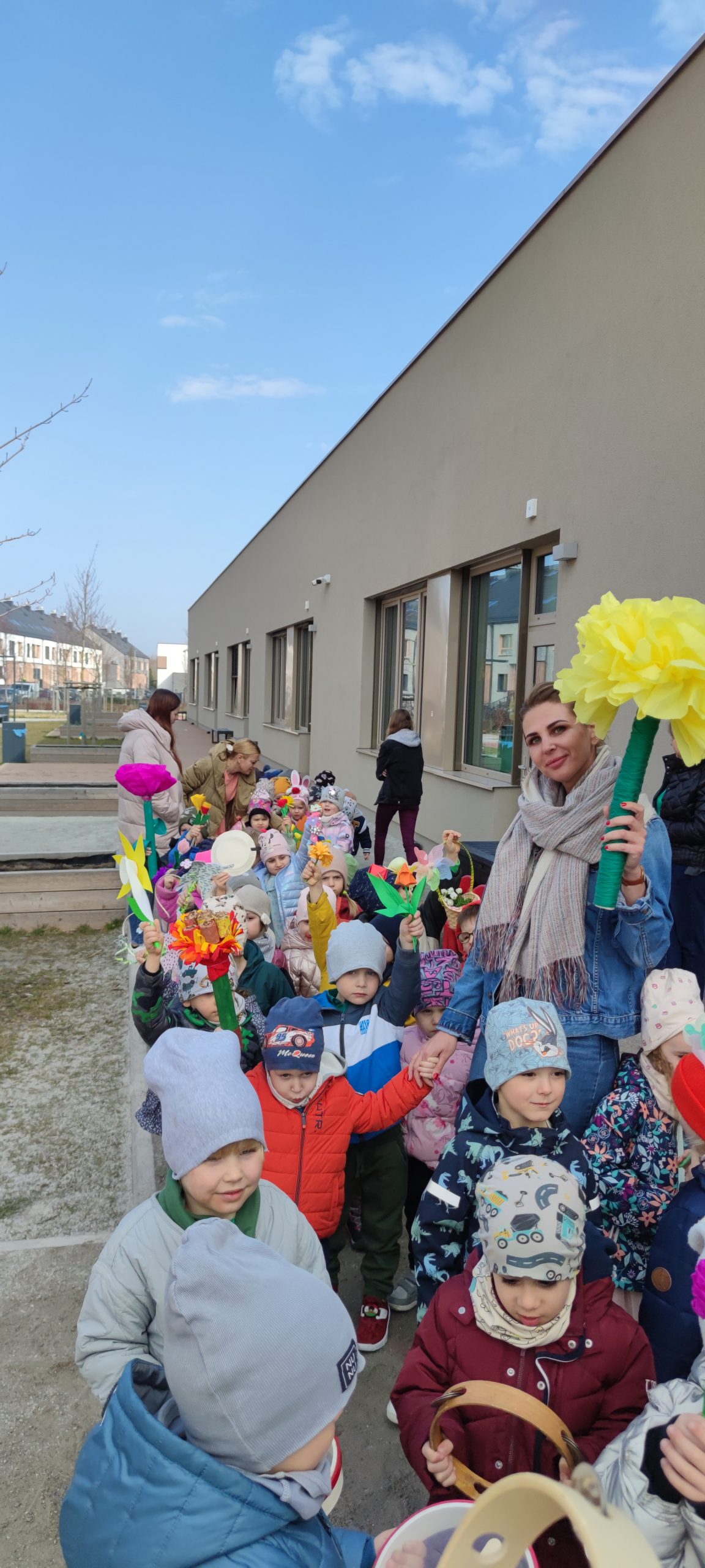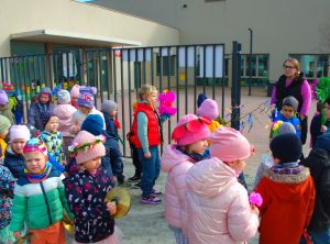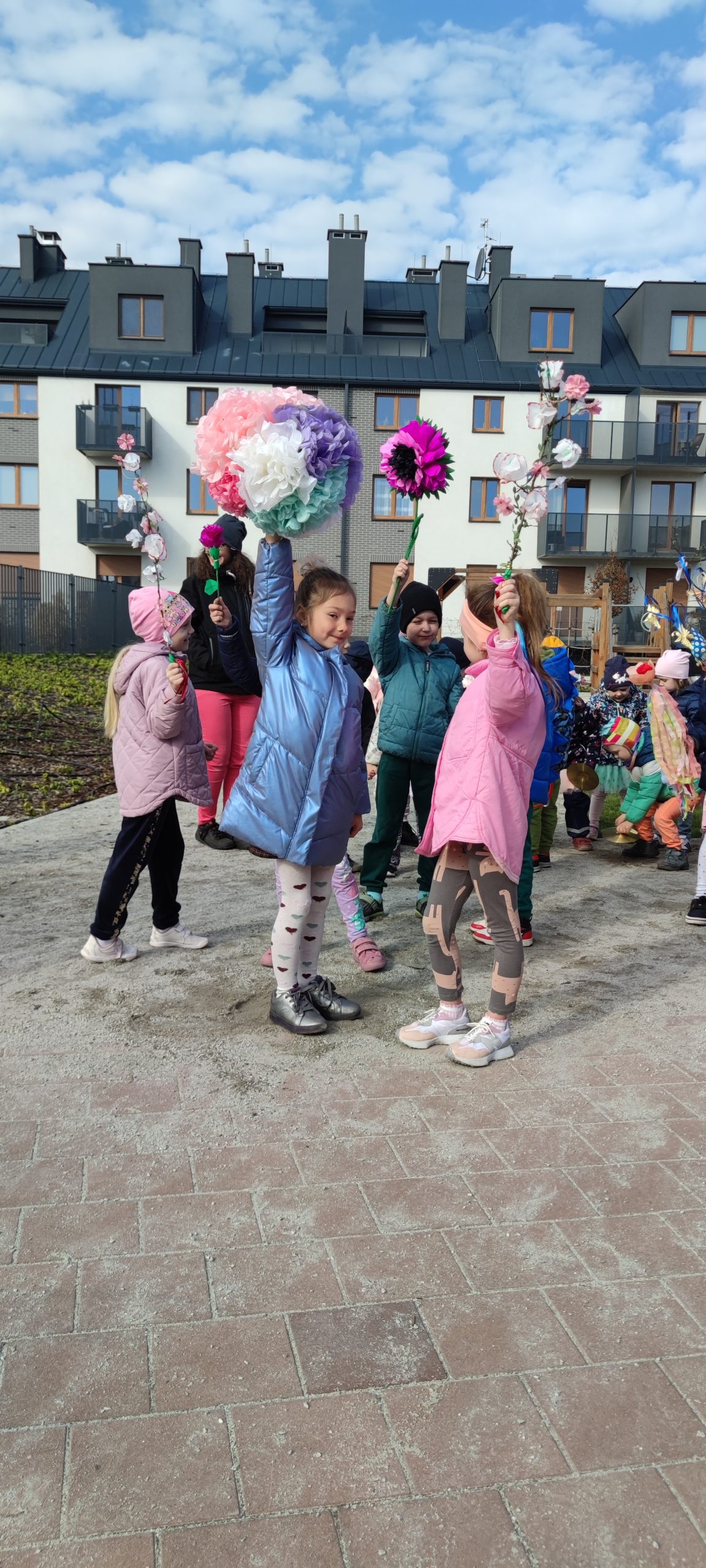 Z okazji Pierwszego Dnia Wiosny przedszkolaki radośnie maszerowały w wiosennym korowodzie po terenie przedszkola i szkoły, niosąc kolorowe wianki, ozdoby oraz grając na instrumentach muzycznych. Barwny pochód pełen uśmiechu i śpiewu był wyrazem radości dzieci z nadejścia nowej pory roku.