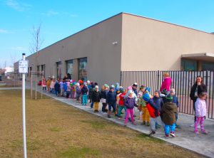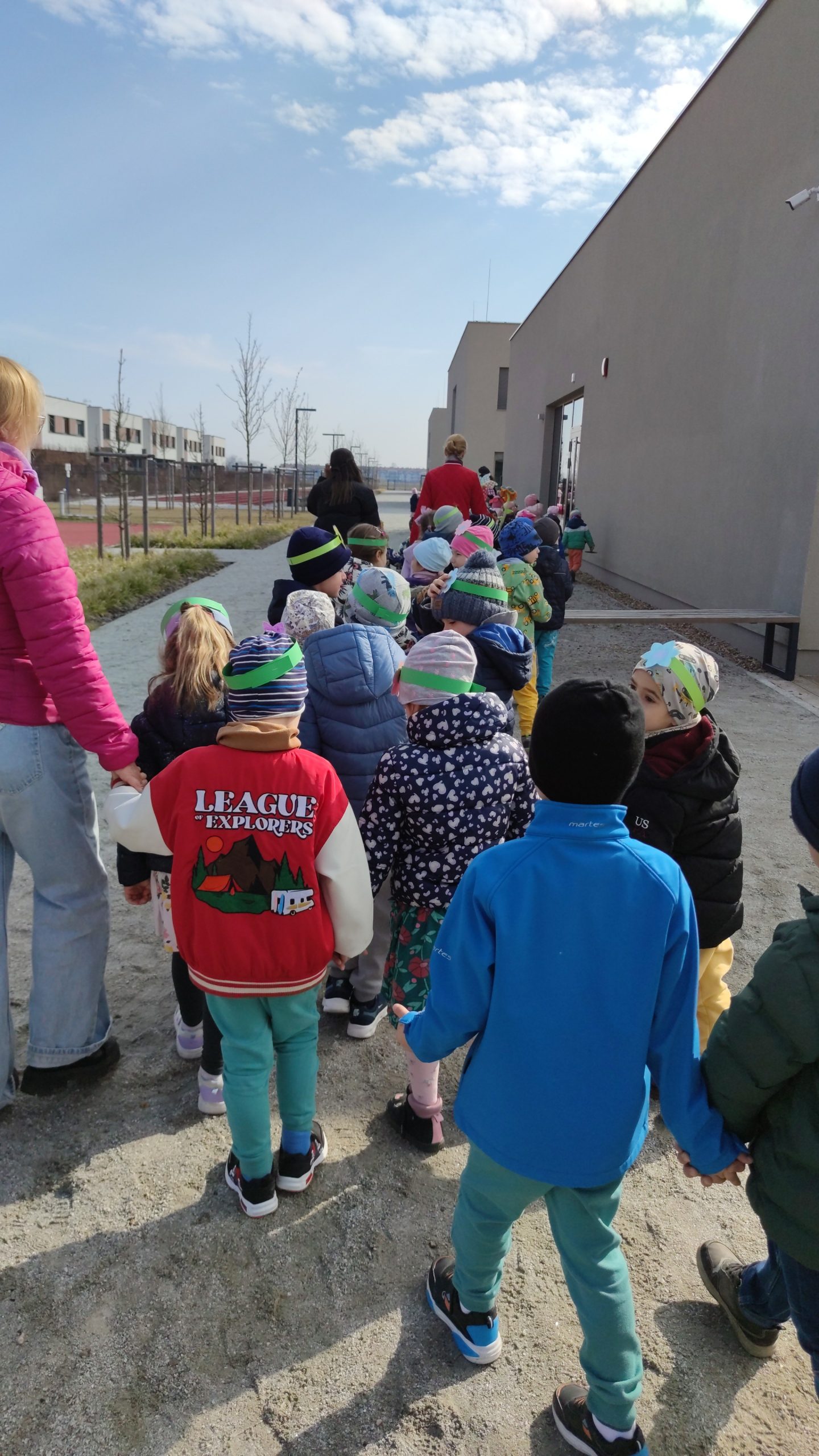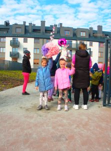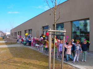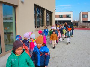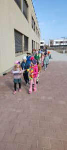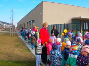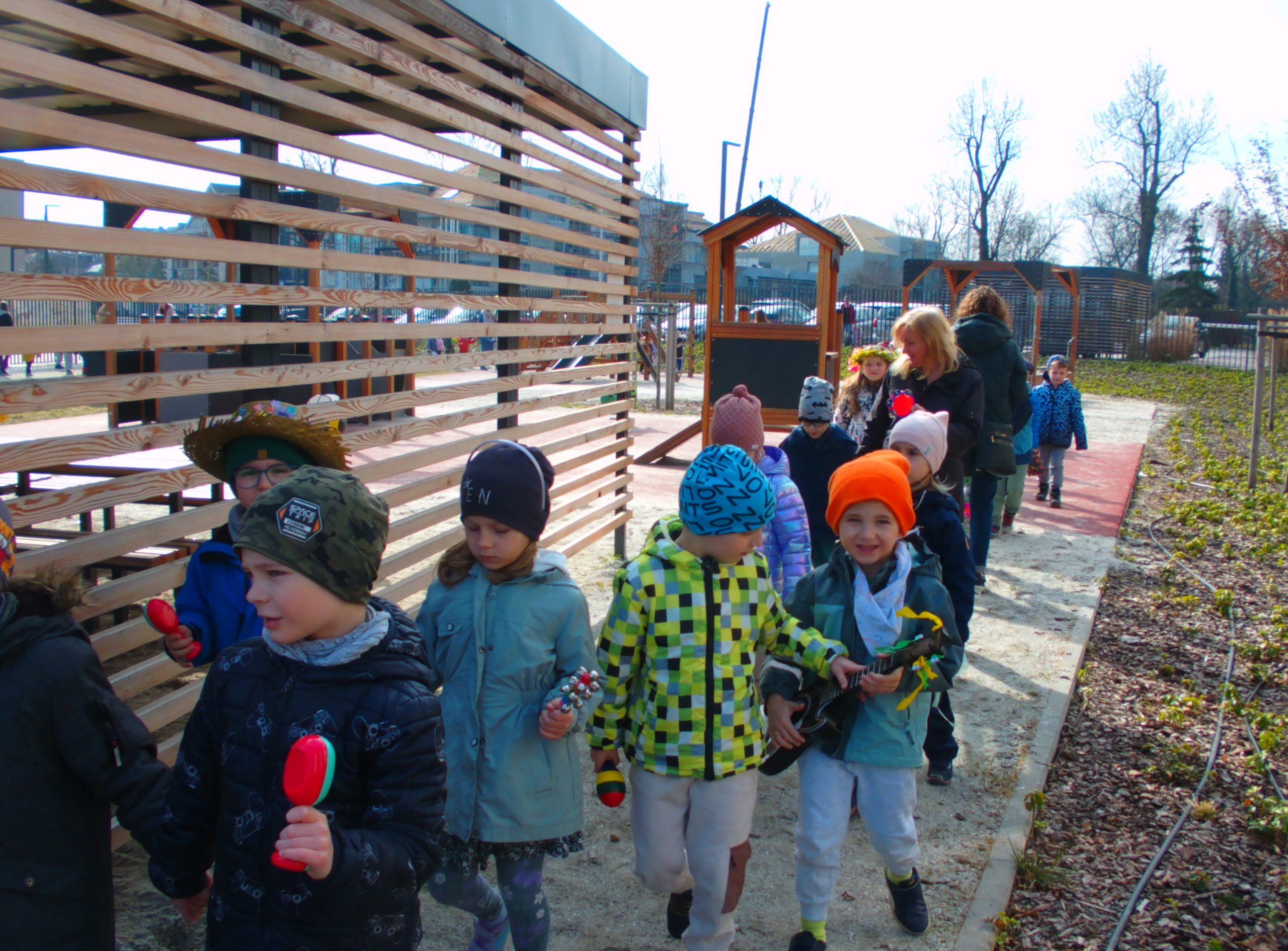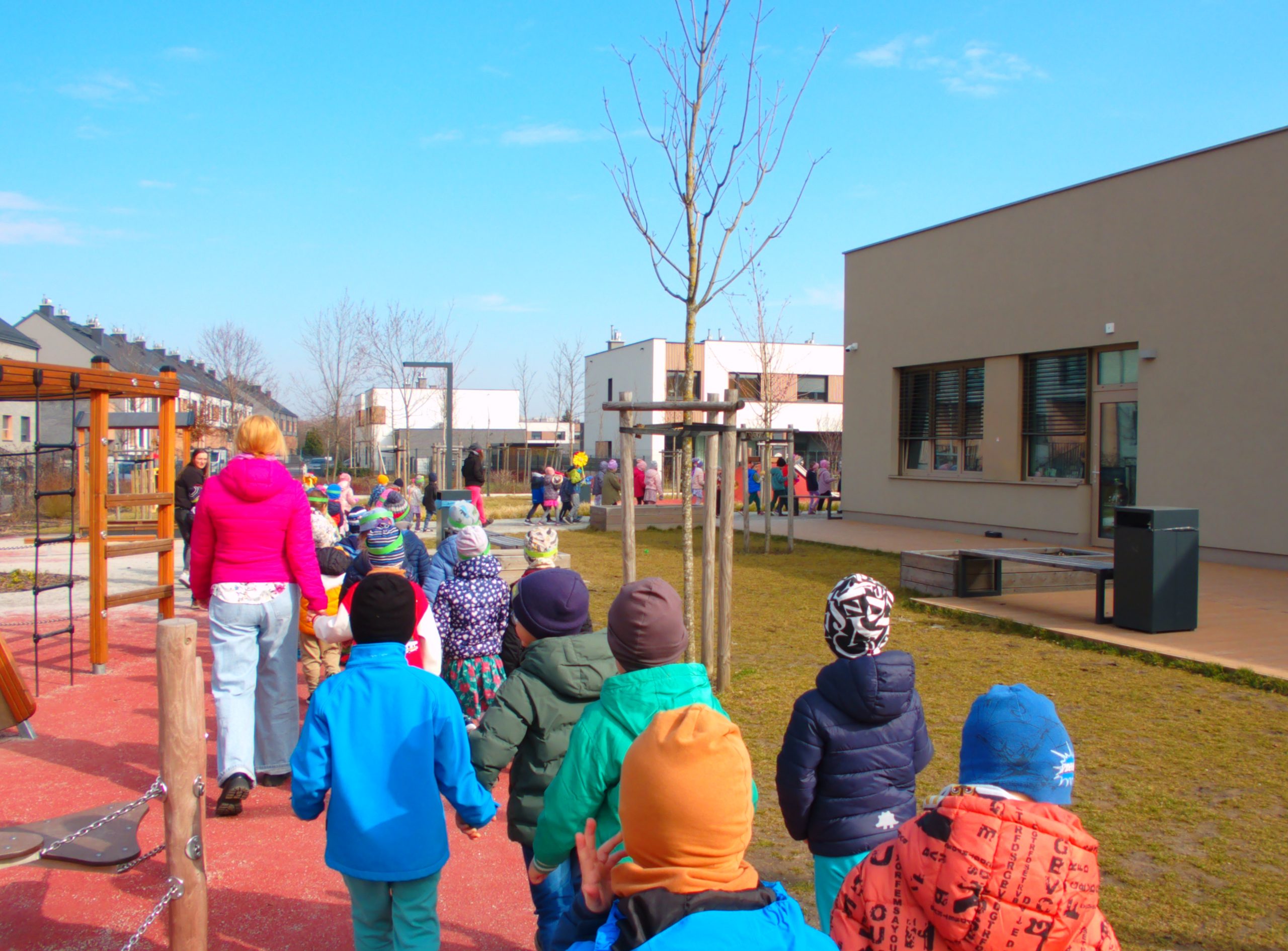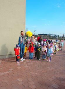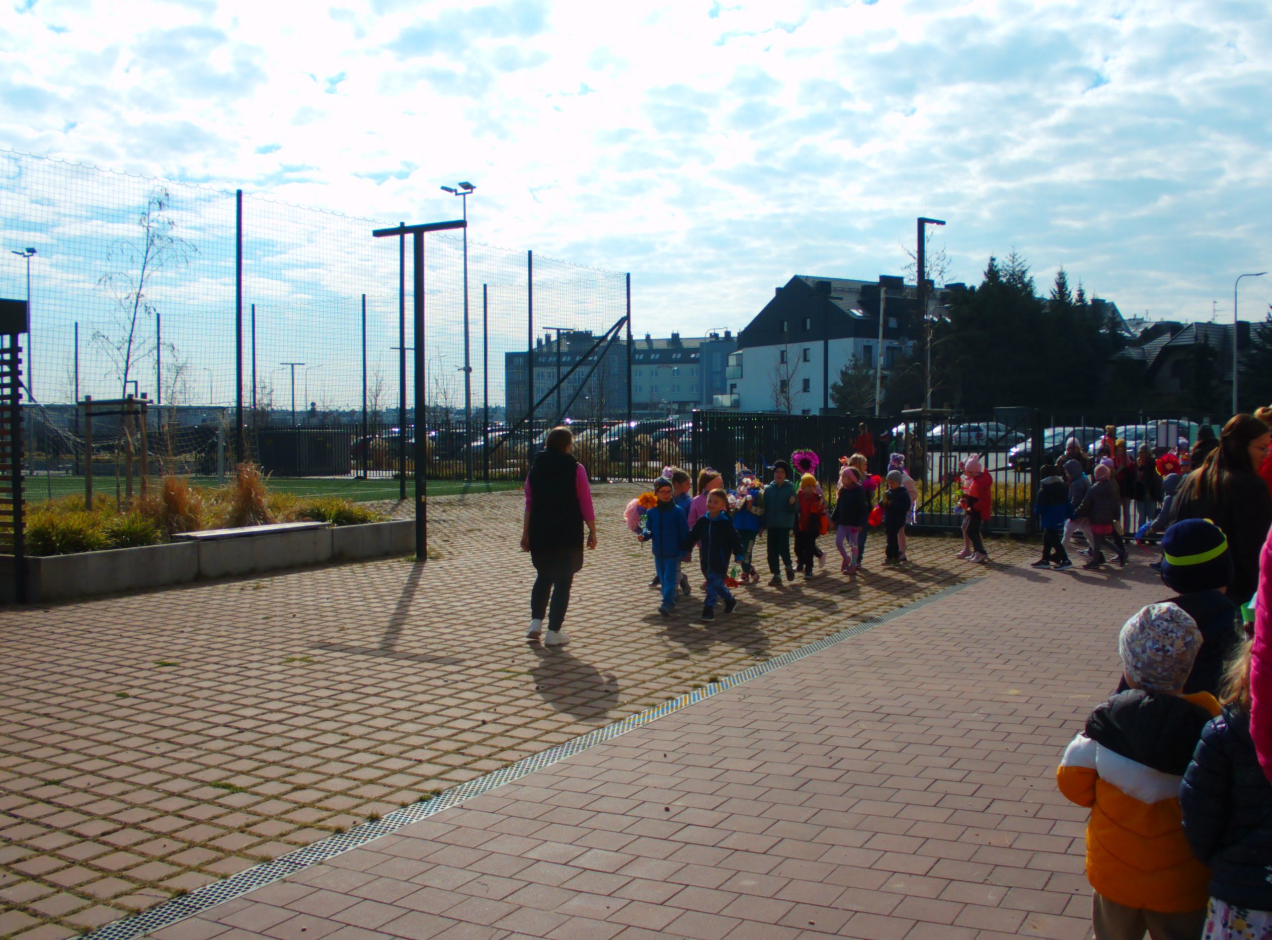Z okazji Pierwszego Dnia Wiosny przedszkolaki radośnie maszerowały w wiosennym korowodzie po terenie przedszkola i szkoły, niosąc kolorowe wianki, ozdoby oraz grając na instrumentach muzycznych. Barwny pochód pełen uśmiechu i śpiewu był wyrazem radości dzieci z nadejścia nowej pory roku.
