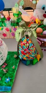Hanna Kłos 2D (koszyczek z jajkami i piórami i królikami zrobionymi z “klocków prasowanych”)
