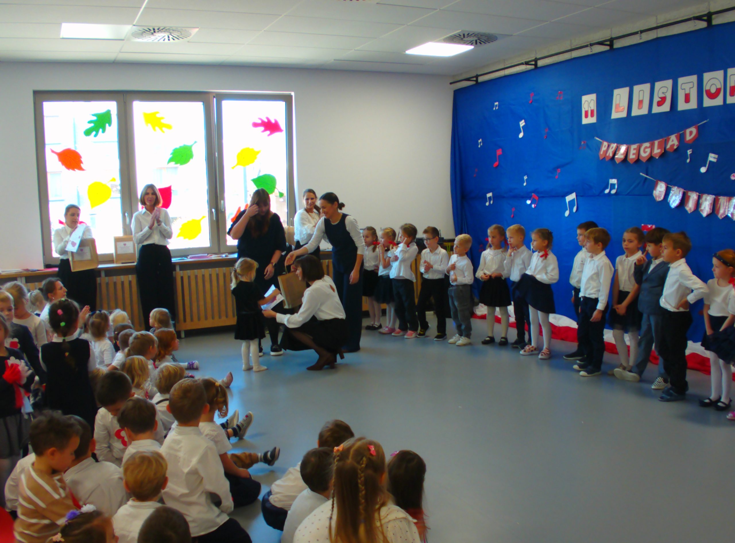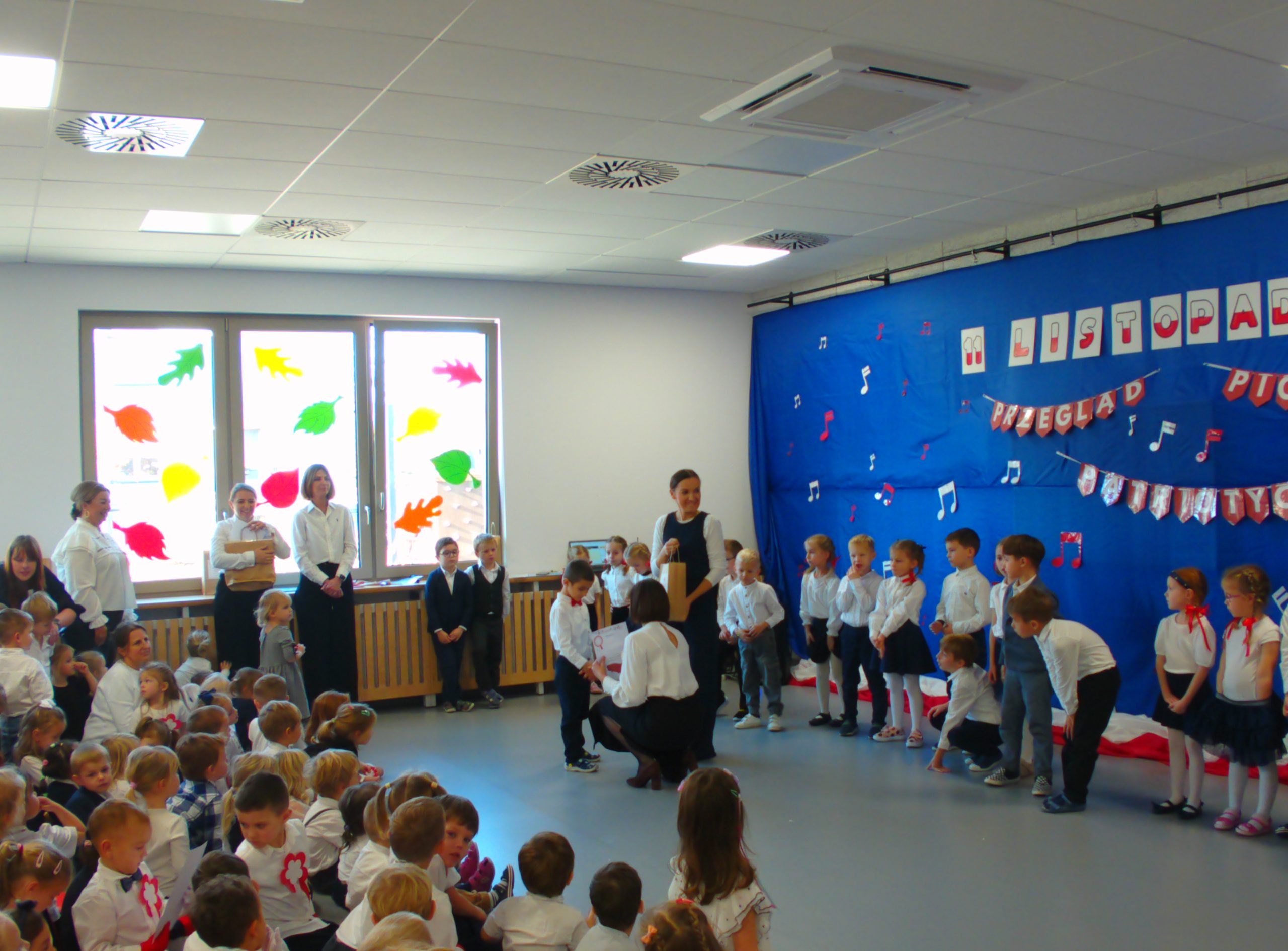 Dzieci śpiewały z ogromnym zaangażowaniem i radością, a cała sala wypełniła się dźwiękami piosenek o Polsce, jej pięknie, symbolach narodowych i miłości do ojczyzny.  Atmosfera była prawdziwie patriotyczna, a jednocześnie pełna ciepła i dziecięcej radości.