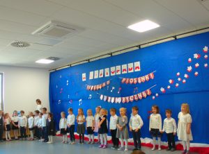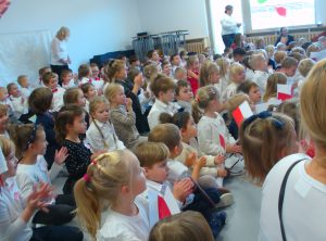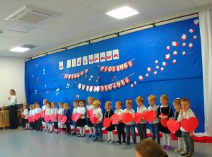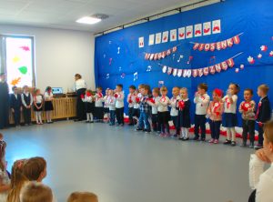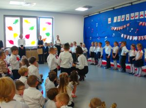Dzieci śpiewały z ogromnym zaangażowaniem i radością, a cała sala wypełniła się dźwiękami piosenek o Polsce, jej pięknie, symbolach narodowych i miłości do ojczyzny.  Atmosfera była prawdziwie patriotyczna, a jednocześnie pełna ciepła i dziecięcej radości.
