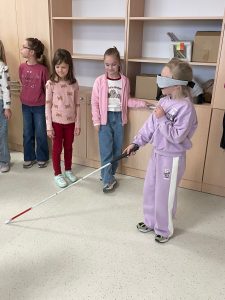 Uczniowie mieli również okazję doświadczyć pewnych ograniczeń, wcielając się na chwilę w rolę osoby z niepełnosprawnością, korzystając ze specjalistycznych pomocy. Zajęcia sprzyjały refleksji, budowaniu empatii i lepszemu zrozumieniu drugiego człowieka.