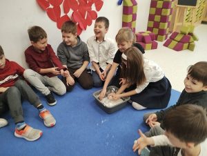 Podczas wielu zajęć uczniowie mieli możliwość  tworzenia śniegu, badania co pływa i tonie.