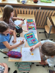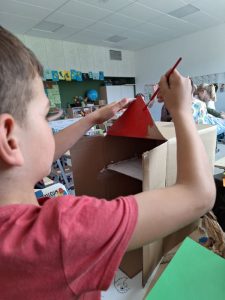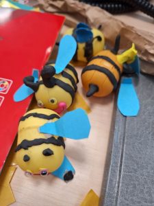 ptaków. Prace były wykonane z najróżniejszych materiałów: pojemników po słodyczach, szyszek, mchu chrobotka. Klasa 1 e podczas zajęć świetlicowych wykonała 2 domki: jeden to dom dla pracowitych pszczół, a drugi to kurnik, w którym nie zabrakło kur i jajek ze styropianu oraz prawdziwego sianka. Dzieciom najbardziej podobała się praca z sianem, ponieważ pachniało świeżo skoszoną trawą. Natomiast w ulu pszczoły były wykonane z opakowań po jajkach Kinder. Uczniowie oddali się fantazji i zaproponowali, aby po naszym ulu ,wykonanym z szarego papieru, spływał miód, zrobiony z kleju na gorąco. Jak widać mamy nie tylko pracowite pszczoły, ale i dzieci również są aktywne i zaangażowane.
