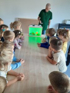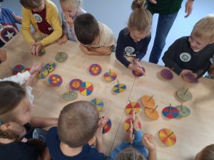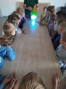 Świat wokół nas jest niezwykle kolorowy. Aż trudno zliczyć, ile barw nas otacza… Ale co by było, gdybyśmy mieli do dyspozycji tylko trzy podstawowe kolory – niebieski, czerwony i żółty? Otóż mieszając poszczególne kolory w odpowiednich proporcjach, moglibyśmy stworzyć niezwykle bogatą paletę barw. Nasze przedszkolaki podczas warsztatów przekonały się, czy (i jak) kolory można pomieszać i co z tego wychodzi. Sprawdziły dlaczego niekiedy kupiona w sklepie zabawka, po przyniesieniu do domu wydaje się znacznie miej atrakcyjna, niż na wystawie sklepowej i czy można ukryć rysunek lub wiadomość tak, aby można ją było odczytać wyłącznie za pomocą światła w odpowiednim kolorze.